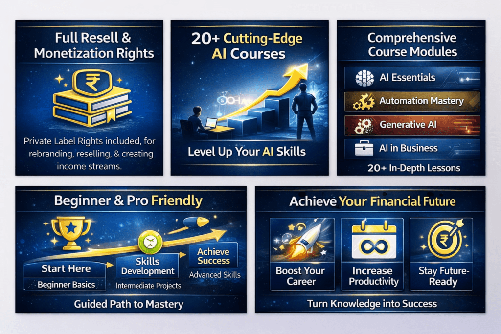 You get 20+ premium AI courses covering ChatGPT, Claude, Perplexity, YouTube Automation, Digital Marketing, Content Creation & much more — along with full PLR rights.